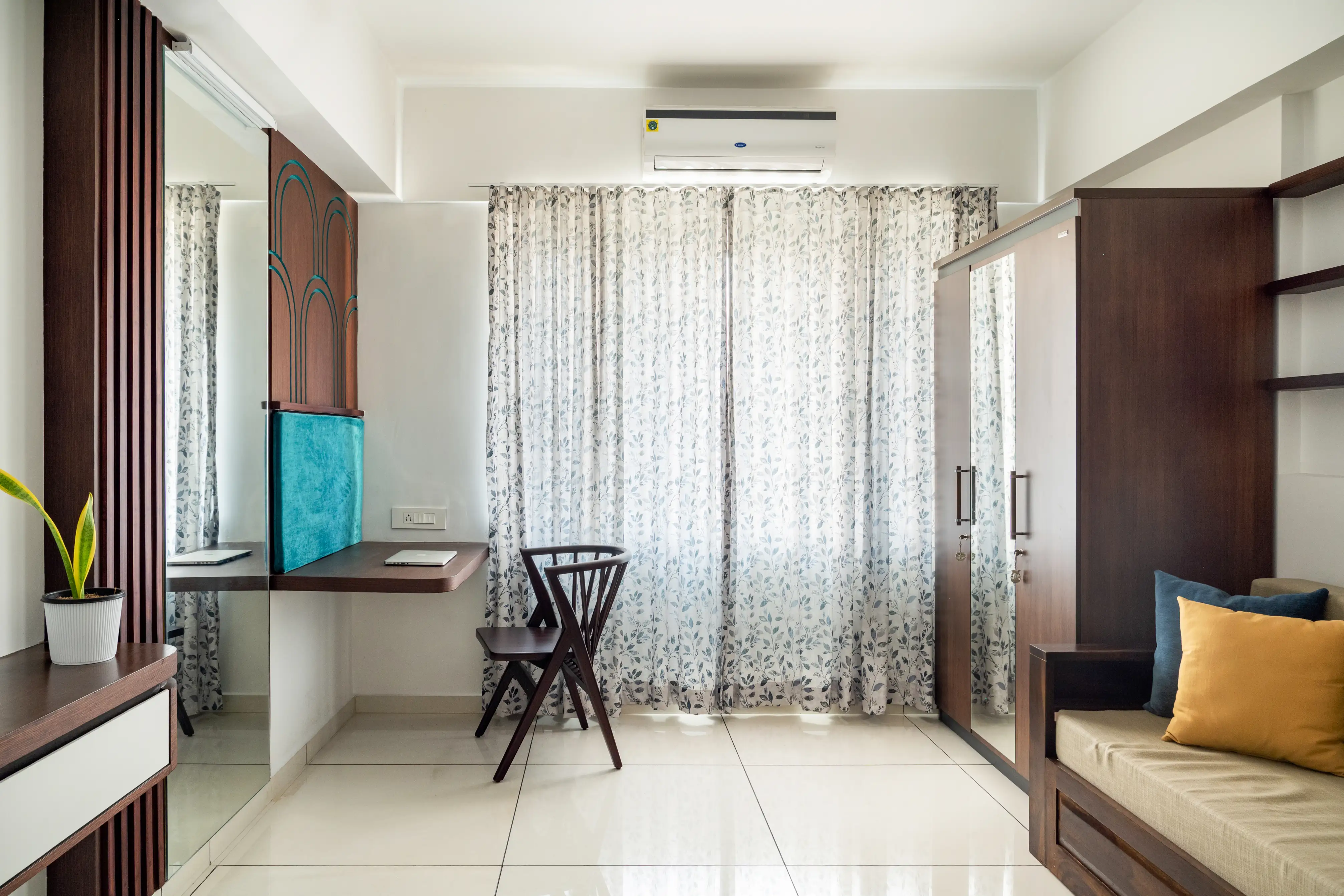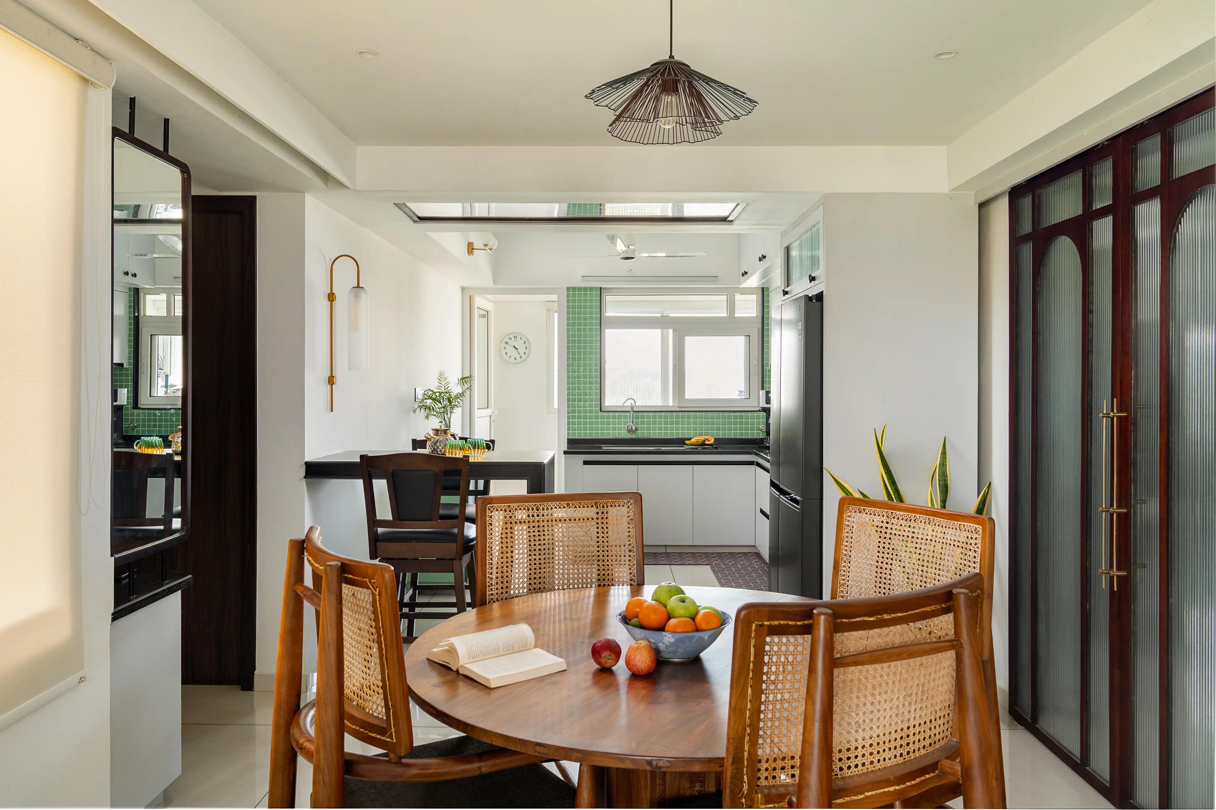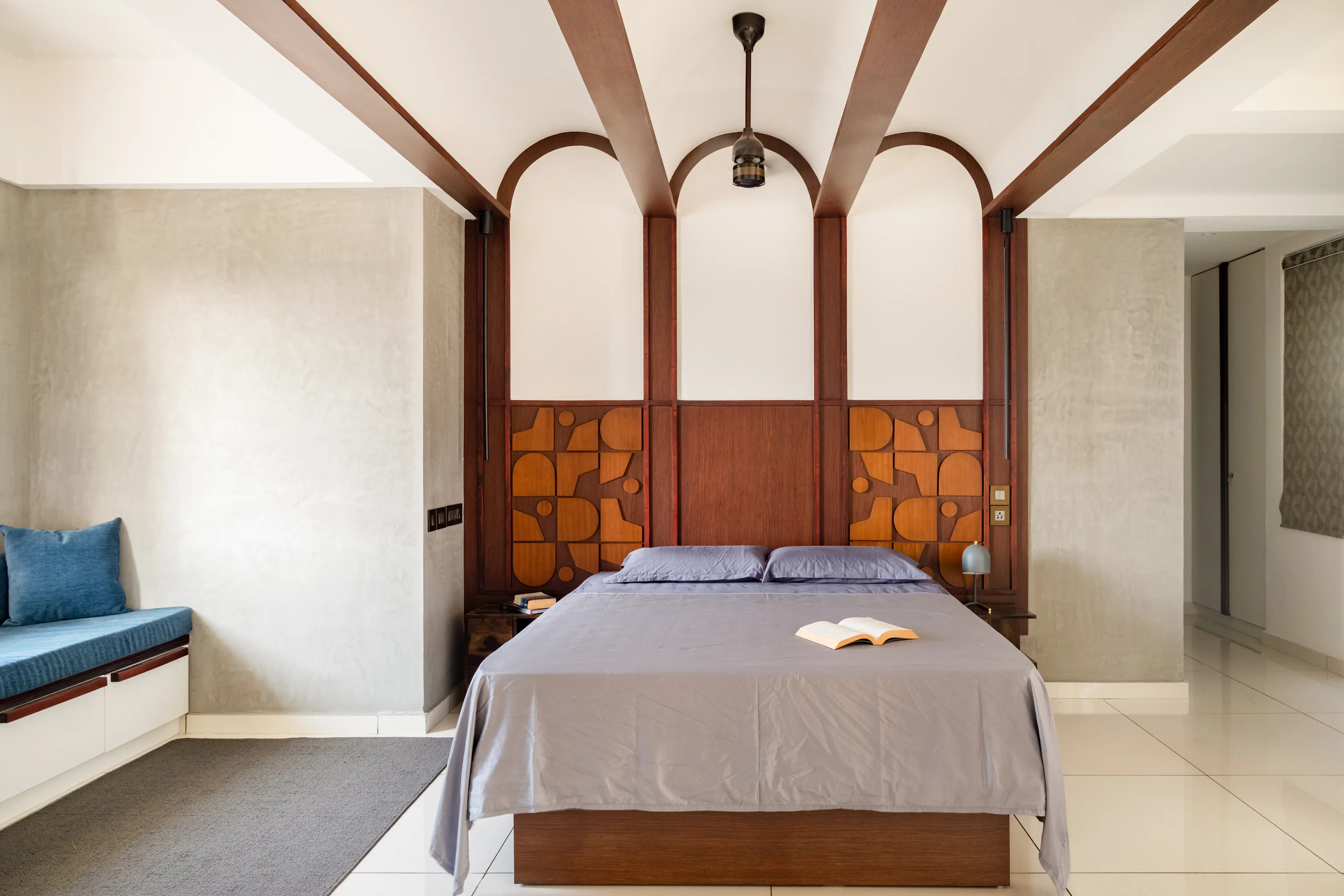 Within its walls, the home unfolds in an array of sophisticated spaces, adorned with selective color splashes, high-quality upholstery, and bespoke elements like a wooden pooja cupboard and elegantly arched ceilings, doorwards and headboards. The kitchen dazzles with its functional beauty, setting a backdrop for warmth and culinary creativity.