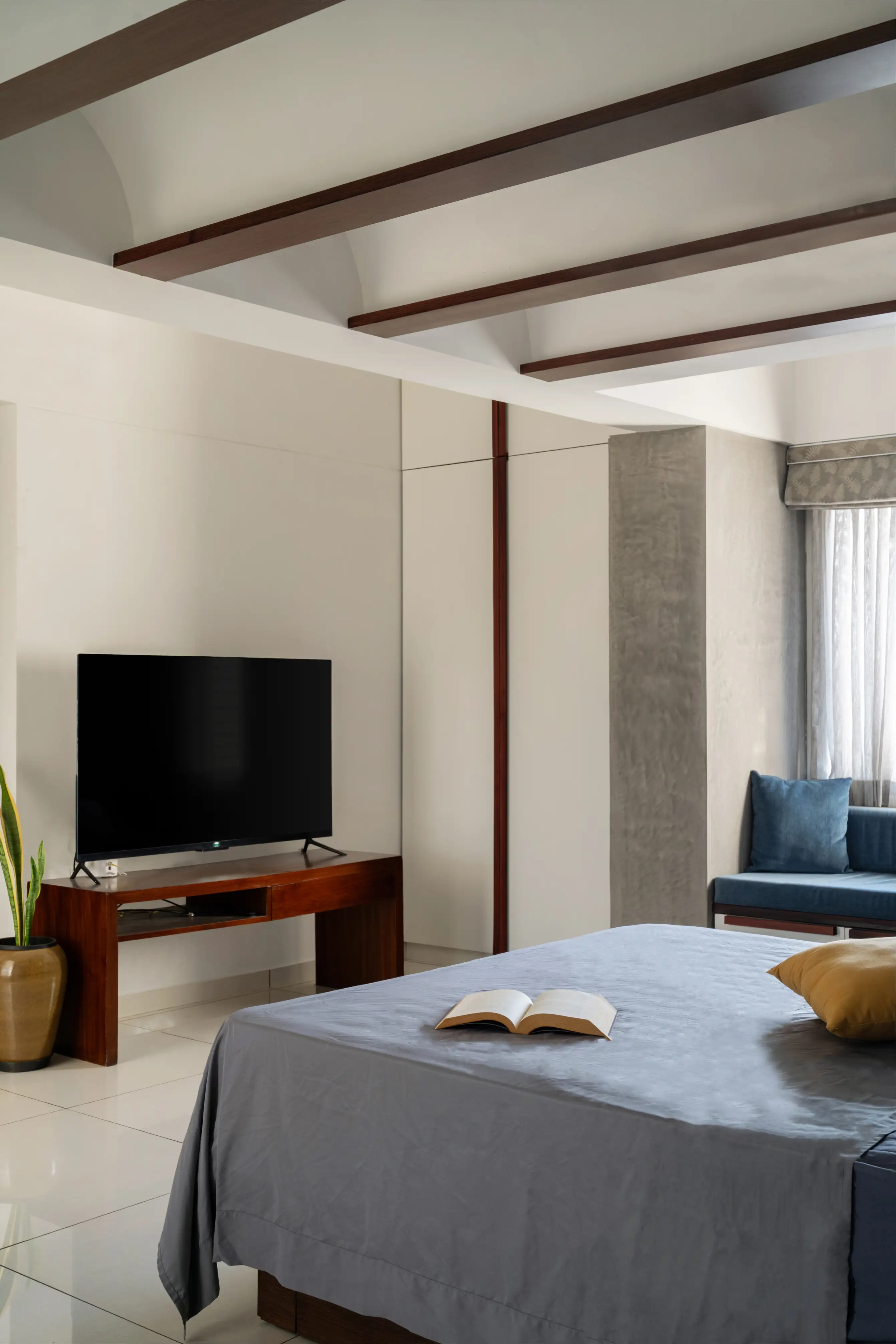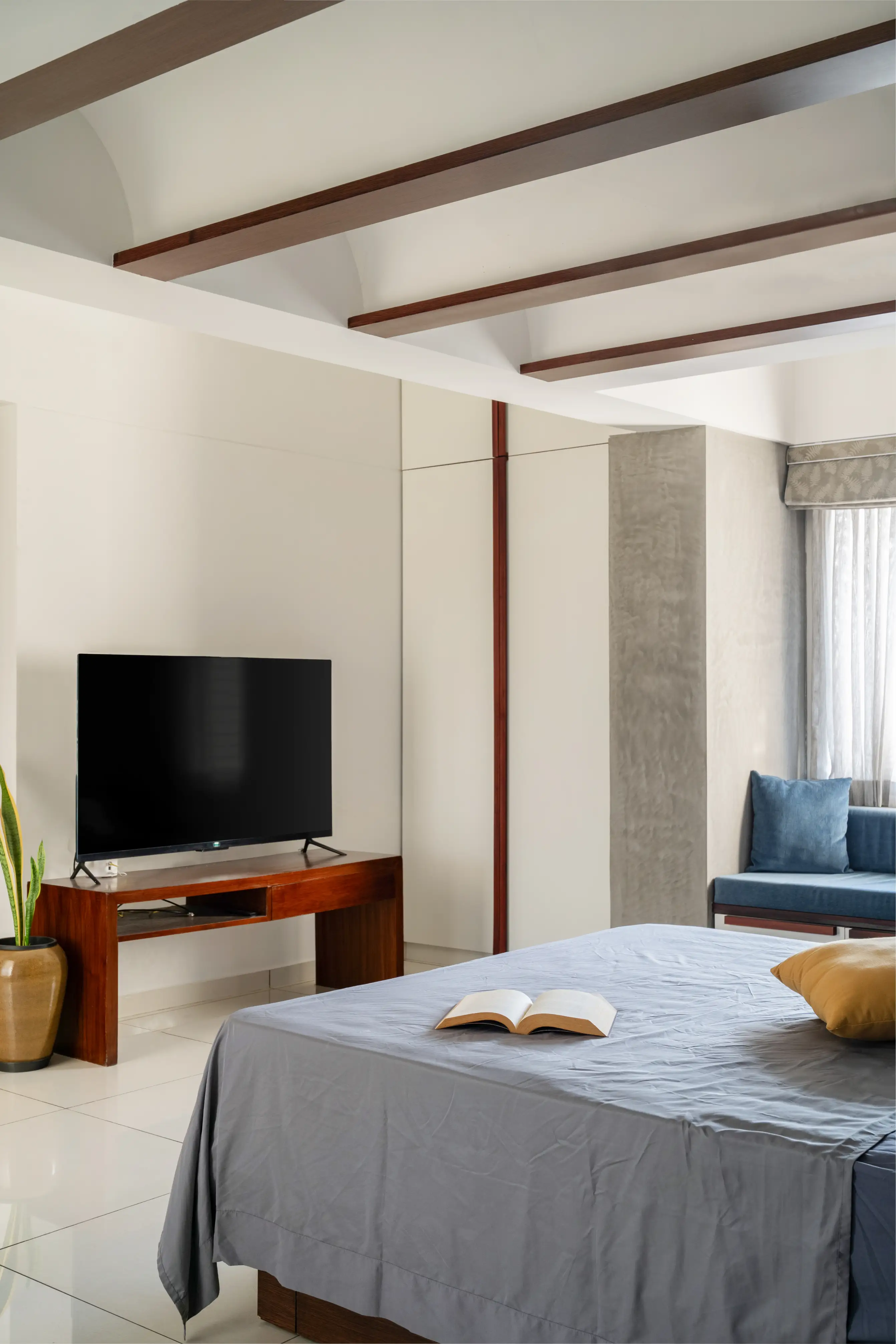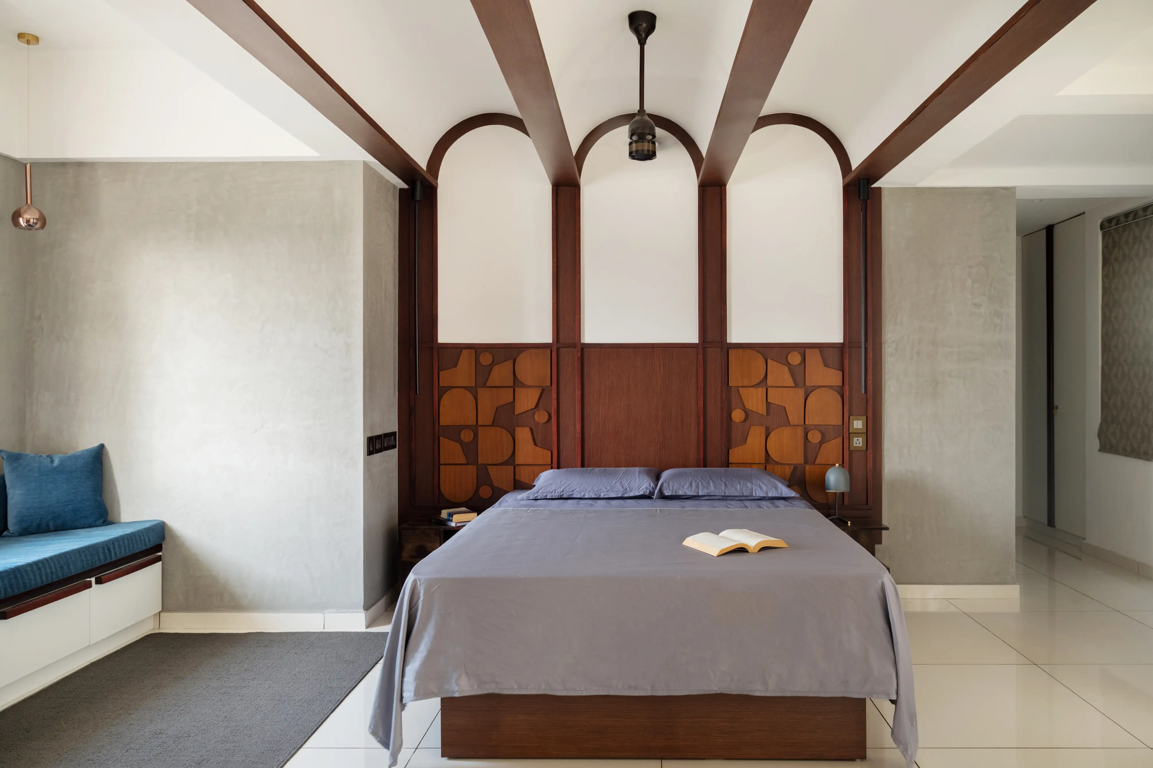Within its walls, the home unfolds in an array of sophisticated spaces, adorned with selective color splashes, high-quality upholstery, and bespoke elements like a wooden pooja cupboard and elegantly arched ceilings, doorwards and headboards. The kitchen dazzles with its functional beauty, setting a backdrop for warmth and culinary creativity.